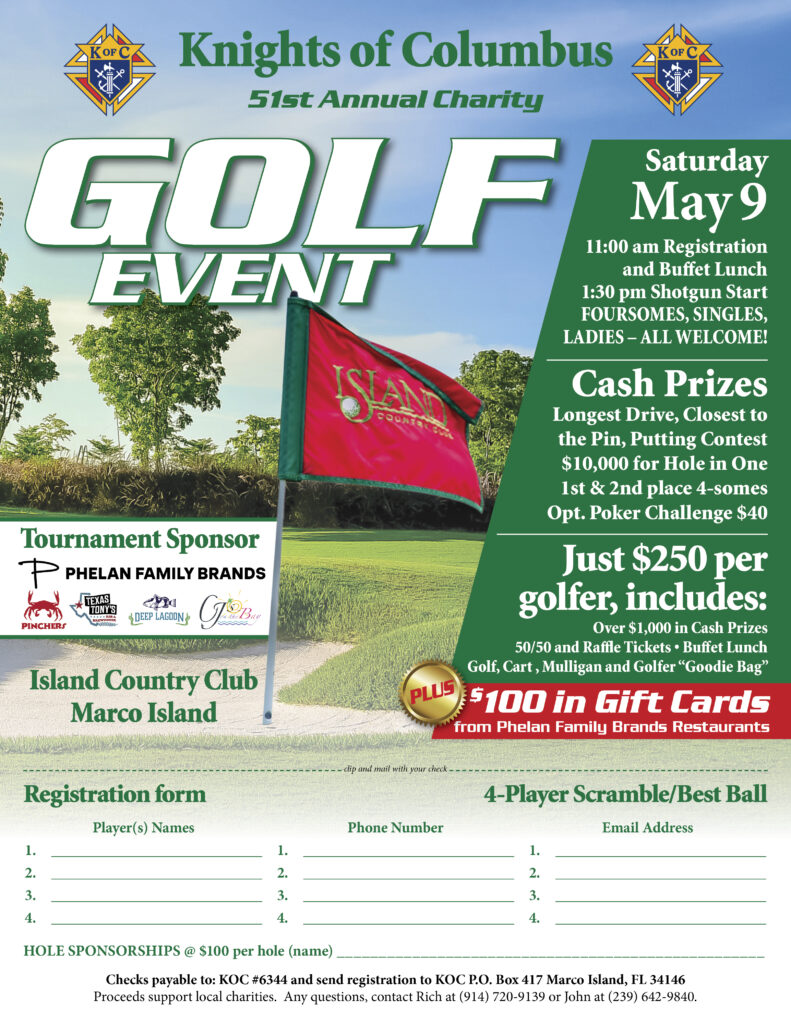 On Saturday, May 9, 2026, the Knights of Columbus San Marco Council #6344 will host the Annual Golf Tournament at the Island Country Club at 500 Nassau Road, Marco Island, FL 34145.  Registration from 11:00 AM to 12:15 PM.  Shotgun Start at 1:30 PM, also Putting Contest and optional Poker Challenge.  The tournament will award cash prizes for 1st & 2nd Place Foursomes, Longest Drive, Closest to Pin and a $10,000 Hole-in-one prize.  Your $250 donation includes buffet lunch, golf, cart, mulligan, and golfer “goodie” bag.  There will be a 50/50 drawing and raffle prizes.  Come join us for an afternoon of fun.  To sign up for the tournament, mail in a filled in registration form with payment (see flyer below).  For more information, contact 239-389-5633.